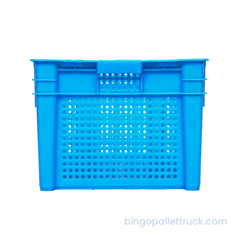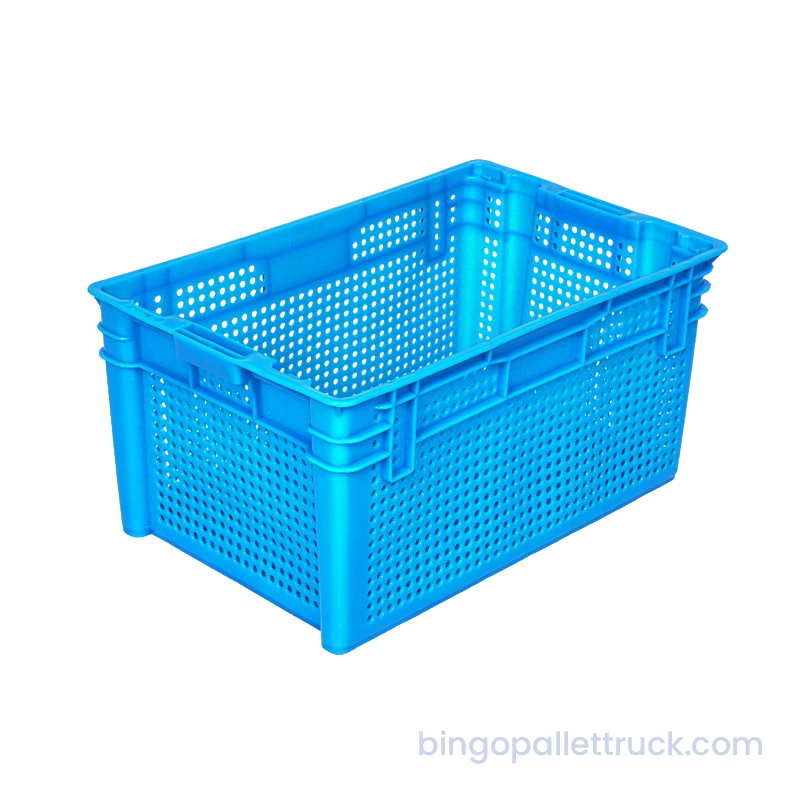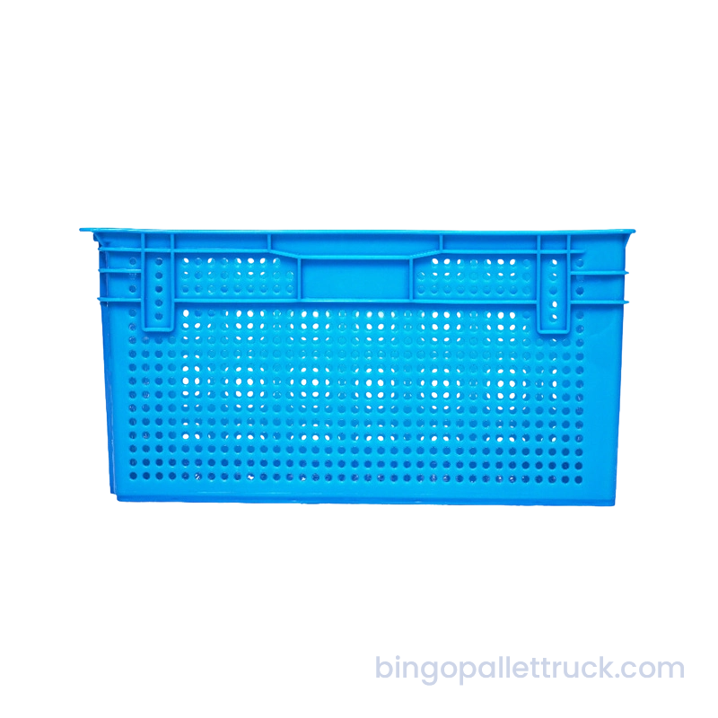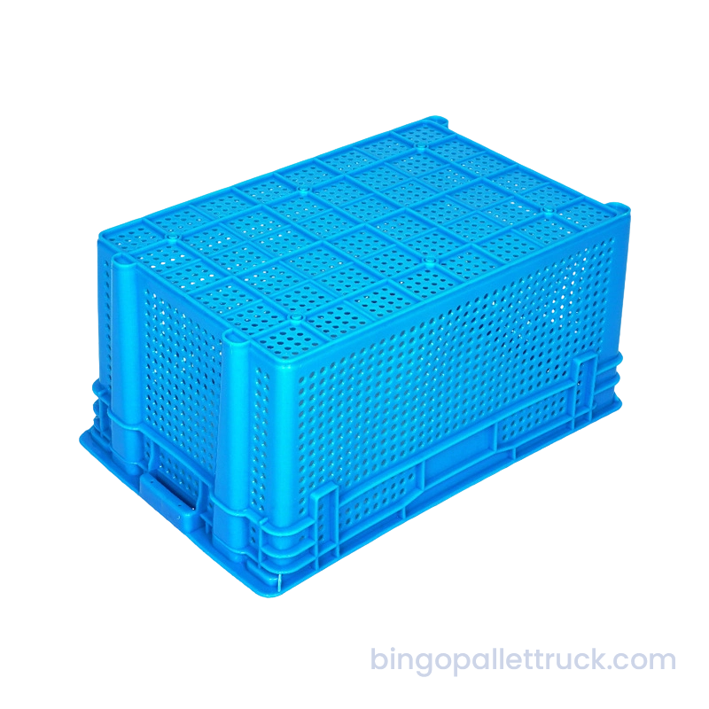 This 635×415×300mm stackable and nestable plastic crate is designed for heavy-duty industrial logistics applications. Manufactured from high-impact food-safe HDPE resin, it provides a large nominal volume with internal dimensions 585×378×290mm and a reinforced rib structure for enhanced load-bearing capacity. The stackable and nestable design ensures efficient empty storage and optimized vertical space utilization. With a net weight of 2kg, the crate features a fully perforated mesh structure for excellent ventilation, making it durable, reusable, and optimized for warehouse storage, cold chain distribution and supermarket operations.